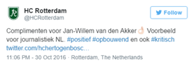 "De afgelopen jaren heb ik verschillende keren Jan Willem van den Akker van dichtbij aan het werk gezien. Daarbij heb ik kunnen vaststellen hoe professioneel hij bezig is als allround media-man. Wat de mensen raakt, is zijn passie, zijn vriendelijkheid en empathie in alles wat hij onderneemt. Veelzijdigheid is zijn handelsmerk. En daarbij voel je je thuis bij hem en dat gevoel brengt mede de kwaliteit in zijn werk. Iedereen werkt graag met hem samen en ook ik doe dat graag. Dat alles maakt hem niet voor niets tot een veelgevraagd organisator, presentator en spreker die hij is."